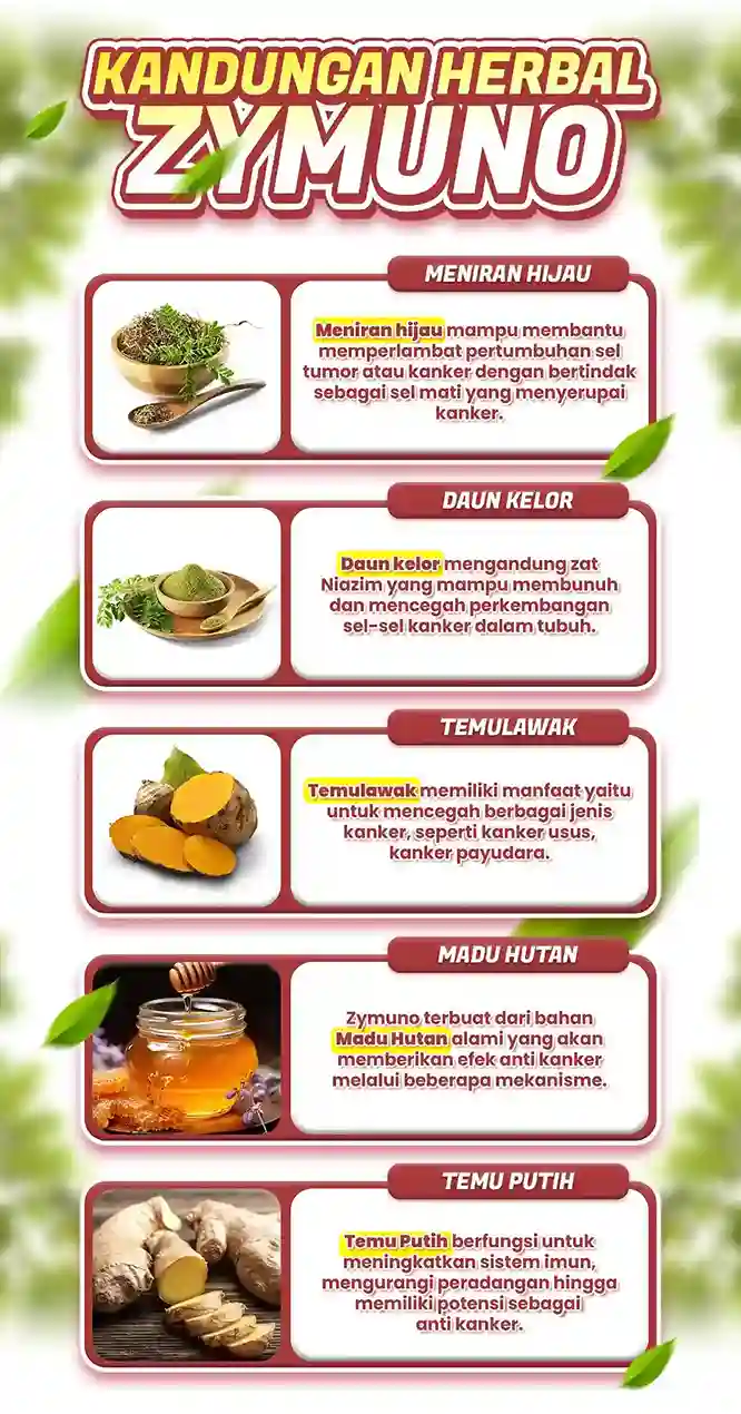 MADU ZYMUNO terbuat dari bahan herbal alami yang diformulasikan oleh peneliti terkemua dengan 5 bahan aktif yang efektif mencegah, mengatasi serta mempercepat proses penyembuhan dan mampu melawan berbagai serangan virus peyakit seperti benjolan, kanker, keputihan berlebih dan miom serta kista.